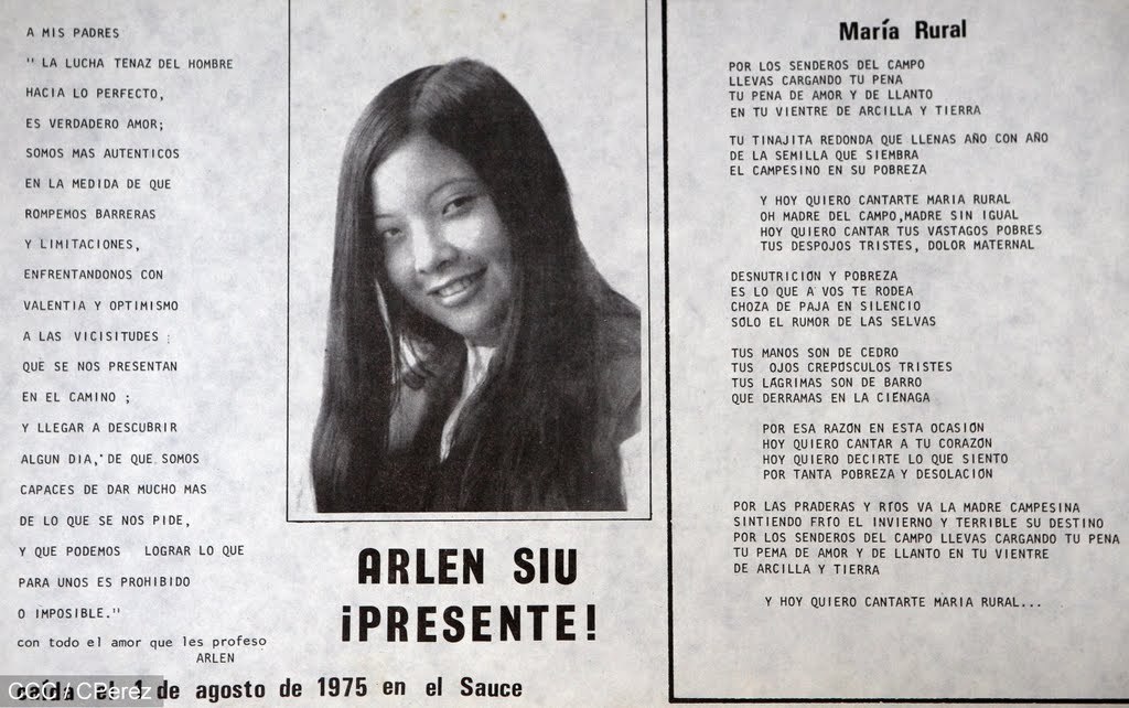“Ella era una muchacha muy alegre, de buenos modales, le gustaba mucho cantar, escribía sus canciones. Yo recuerdo a mi hija con mucho amor, con mucho cariño, ella fue una muchacha que sentía amor por su patria, ella pensaba en los pobres, en la pobreza de Nicaragua, también por aquella gente que era maltratada en ese entonces por las autoridades. Arlen decía que era una injusticia la que hacía el gobierno de ese entonces”, recuerda Rubia Bermúdez de Siu, mamá de Arlen.