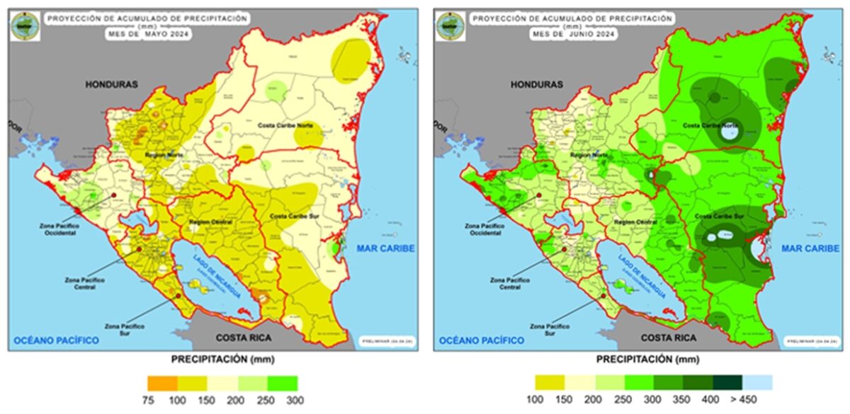 Costa Caribe Norte: los acumulados de precipitación oscilarán entre 650 milímetros en el sector oeste (Siuna, Mulukukú y Waslala) y 900 milímetros en el sector de Waspam, Puerto Cabezas y Prinzapolka, obteniéndose acumulados de lluvia en el rango bajo de lo normal con respecto al promedio de 960 milímetros.